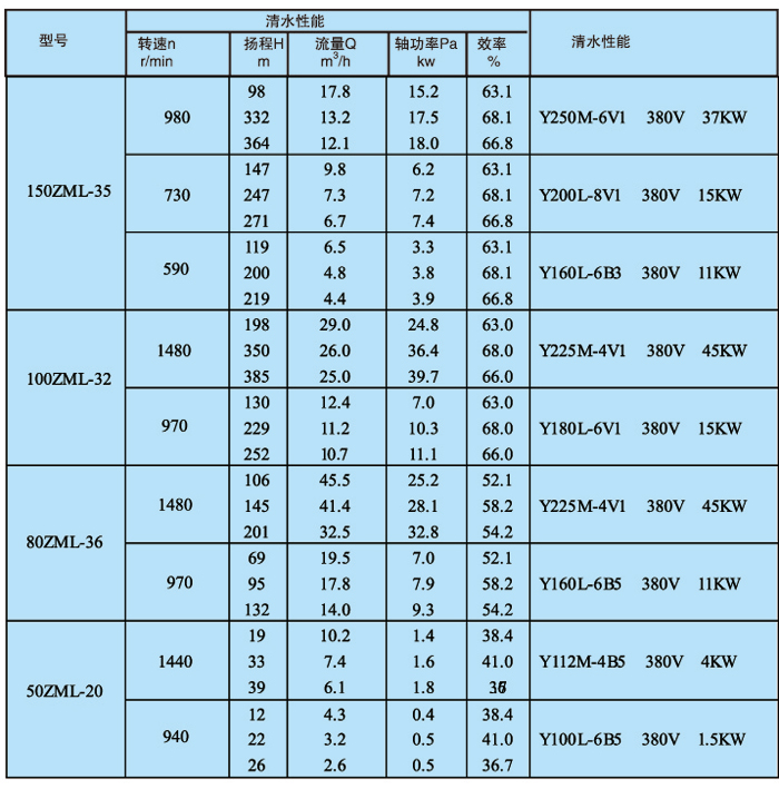 ZML立式渣漿泵主要技術(shù)參數